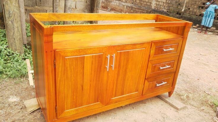 Meuble de cuisine en bois robuste, idéal pour ranger vos ustensiles et accessoires. Équipé de portes et de tiroirs pour un stockage optimal.