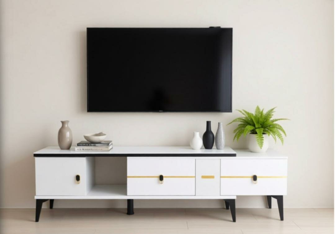 Élégant meuble TV blanc avec lignes dorées et rangement pour une décoration moderne du salon. Idéal pour organiser vos équipements et accessoires.