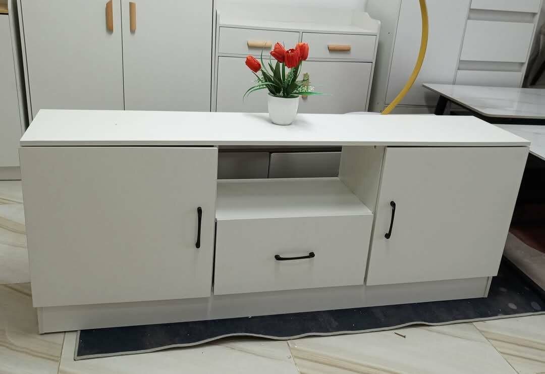 Ce meuble TV moderne et élégant en blanc est l'ajout parfait pour votre salon. Fabriqué avec des matériaux de haute qualité, il offre un espace de rangement pratique avec deux portes et un tiroir central. Son design épuré s'intègre facilement dans tout type de décoration. Idéal pour supporter votre téléviseur et pour ranger vos accessoires multimédia.