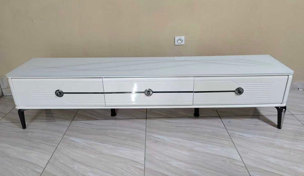 Ce meuble TV moderne blanc avec tiroirs allie élégance et fonctionnalité. Parfait pour organiser votre espace salon, il offre un espace de rangement pratique tout en s'intégrant harmonieusement à tout décor moderne. Sa finition blanche brillante apporte une touche de sophistication.