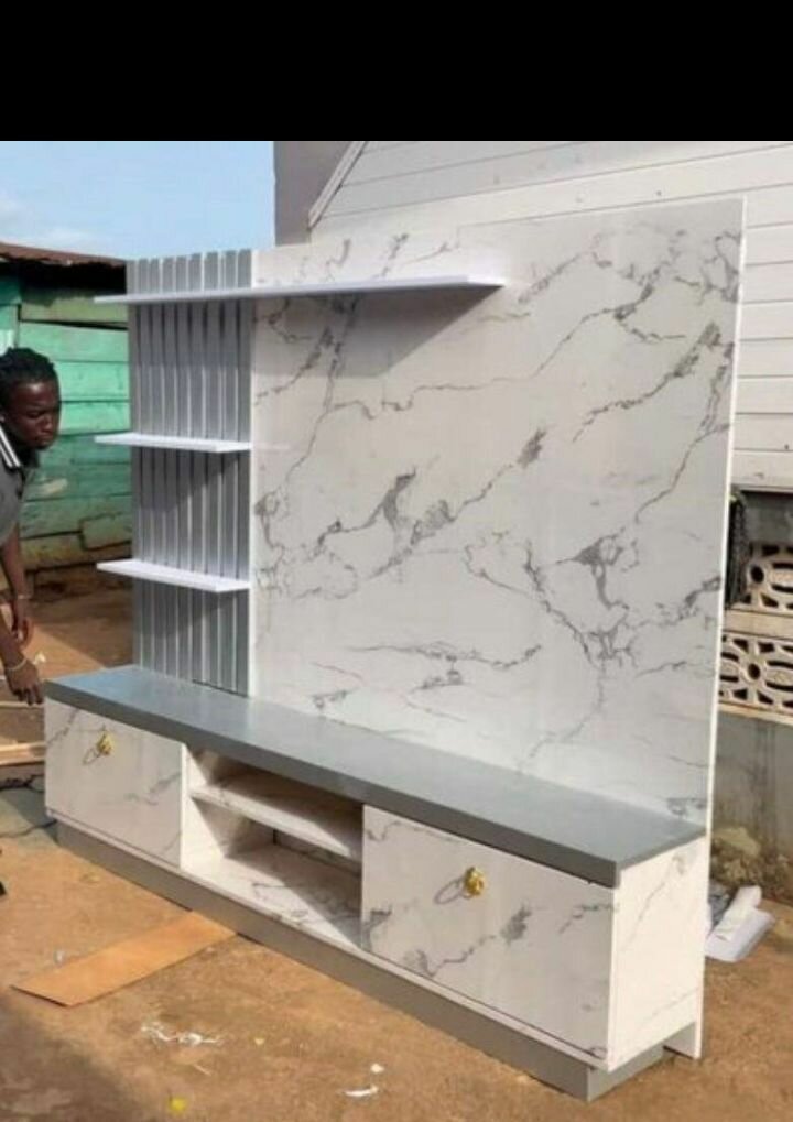 Étagère TV design avec tiroirs et étagères ouvertes, parfait pour salon moderne. Finition marbre blanc élégante.