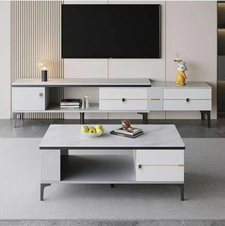 Ajoutez une touche élégante à votre salon avec cet ensemble meuble TV et table basse modernes. Fabriqué avec des matériaux de haute qualité, cet ensemble offre du style et de la fonctionnalité. Idéal pour organiser votre espace de divertissement avec élégance.