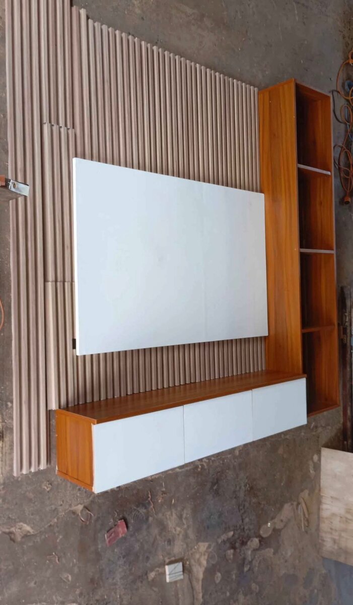 Meuble TV mural moderne avec étagères intégrées, idéal pour un salon élégant. Design en bois et blanc, parfait pour ranger vos accessoires multimédias et décorer l'espace. Transformez votre salon avec style et fonctionnalité!