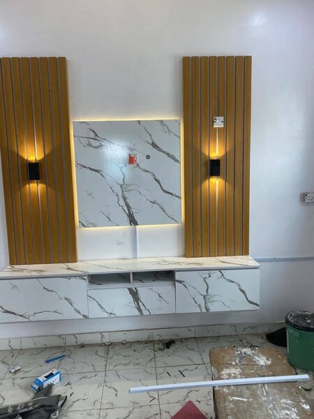 Meuble TV mural marbré avec finition bois, design moderne, parfait pour un salon haut de gamme. Facile à installer et très élégant.