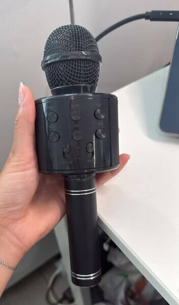Micro karaoké sans fil, couleur noire, état neuf. Son puissant, idéal pour chanter partout grâce à la batterie rechargeable. Prise en main facile avec boutons de réglage intégrés.