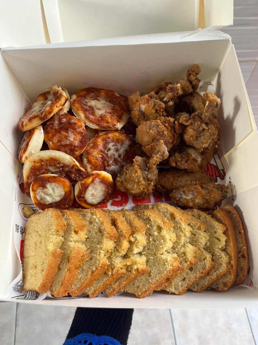 box de 30 pièces 10 mini pizza 10 ailerons Mini bar de cake