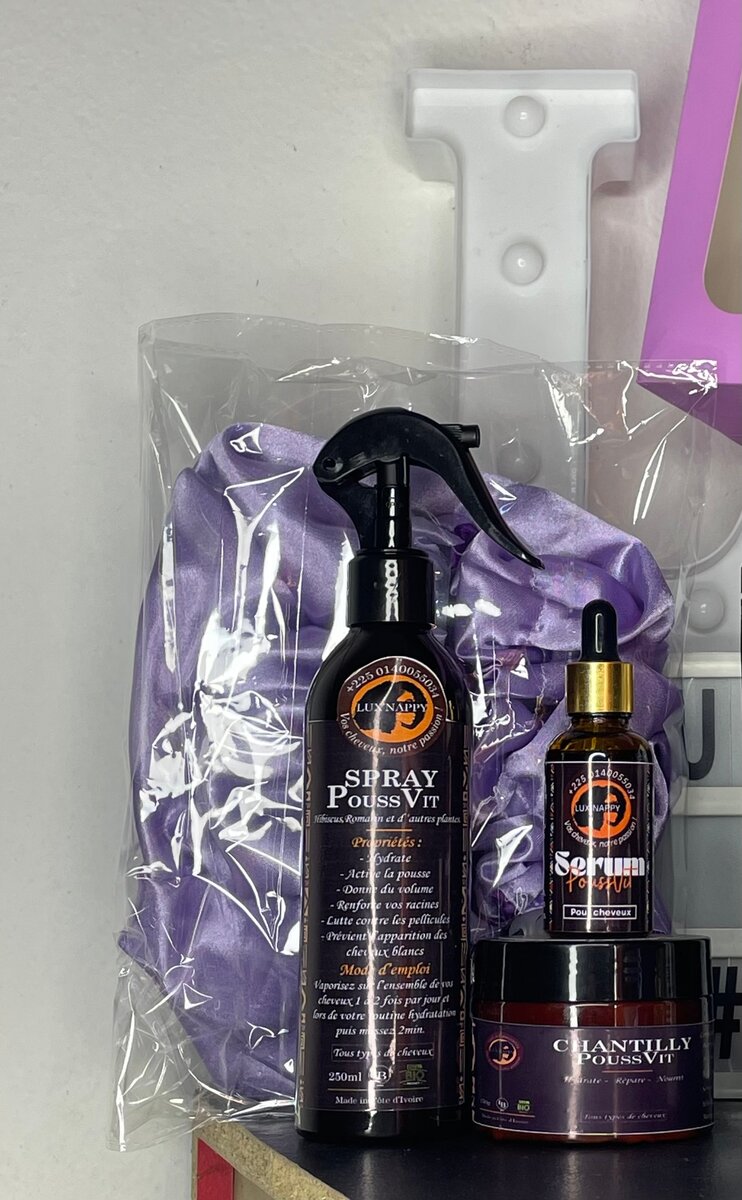 Optez pour notre ensemble de soin capillaire naturel, comprenant un spray revitalisant, un sérum nourrissant, et une chantilly hydratante. Idéal pour hydrater et fortifier vos cheveux, tout en apportant brillance et douceur. Parfait pour une utilisation quotidienne pour des cheveux resplendissants.