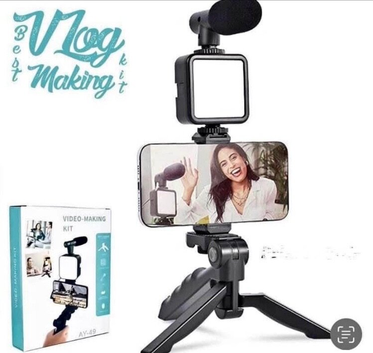 Mini kit vlog composer des touts vos éléments essentiels pour faire des blogs de qualité: micro, trépied, câble, éclairage, support téléphone.