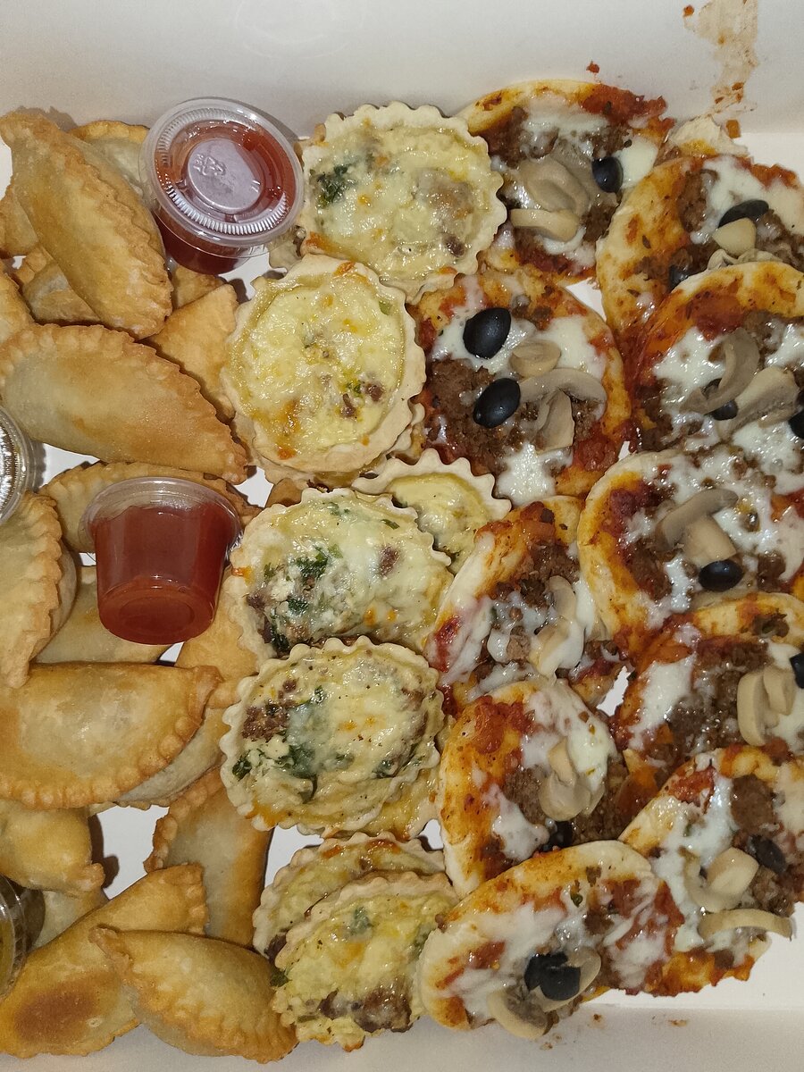 Découvrez un assortiment savoureux de mini pizzas garnies d'olives et champignons et de délicieuses empanadas dorées parfait pour vos apéritifs. Idéal pour les fêtes, repas en famille ou entre amis. Offrez une expérience culinaire unique et savoureuse avec chaque bouchée!