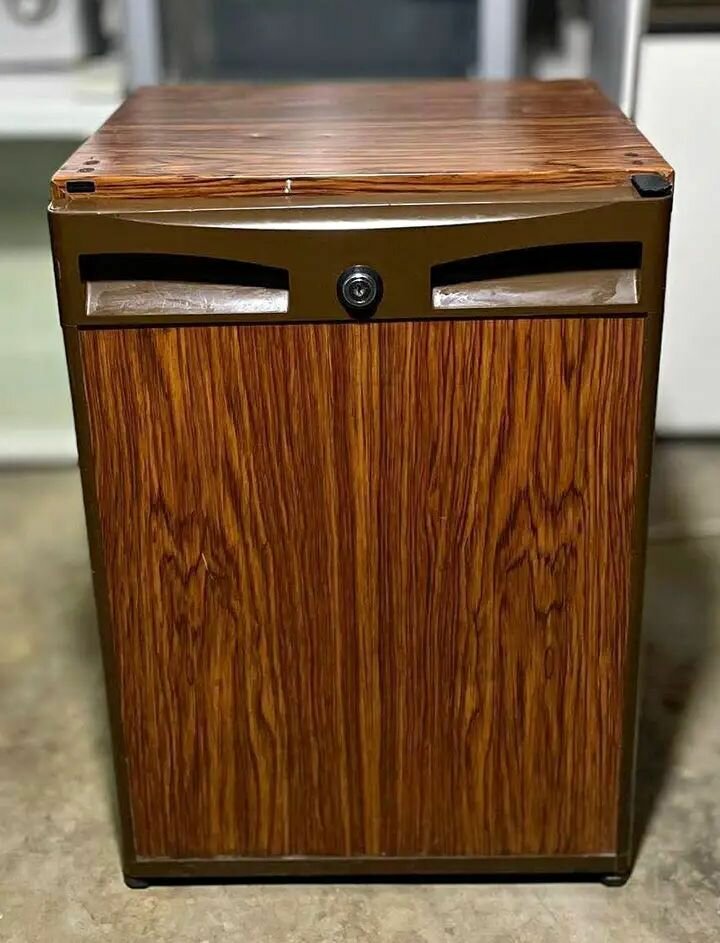 Mini réfrigérateur compact FRILUX, idéal pour les petits espaces. Design élégant en bois, intérieur blanc, parfait pour le bureau ou la chambre. Silencieux et économe en énergie.