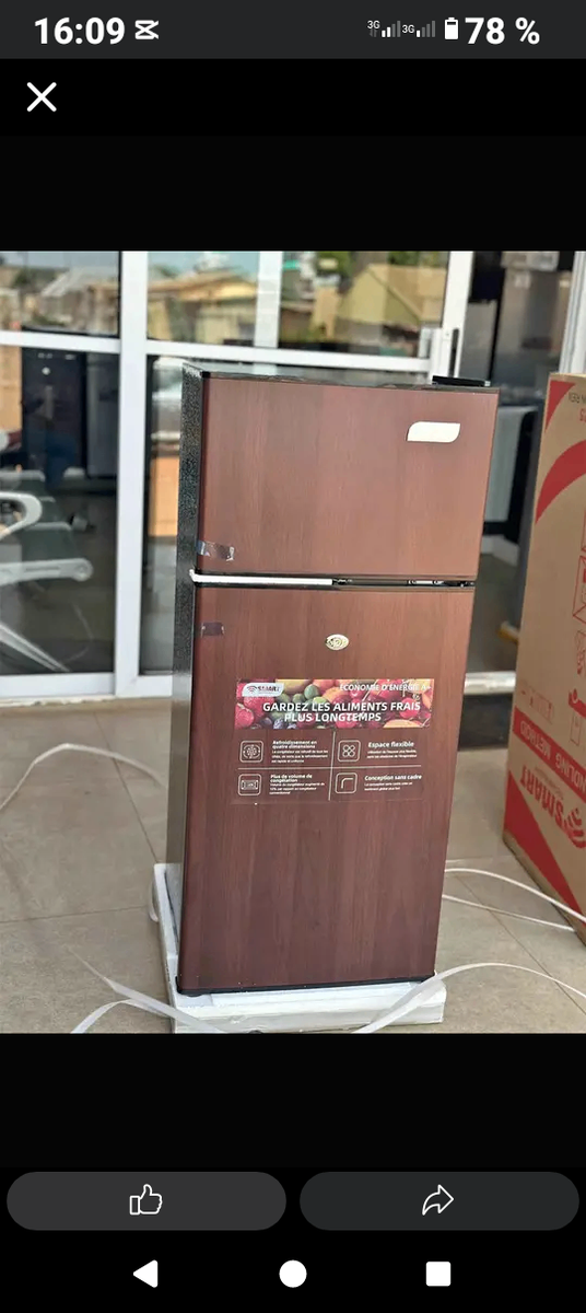 Mini réfrigérateur compact et élégant, idéal pour la chambre, le bureau ou les loisirs. Finition en bois, faible encombrement. Parfait pour stocker boissons et snacks.