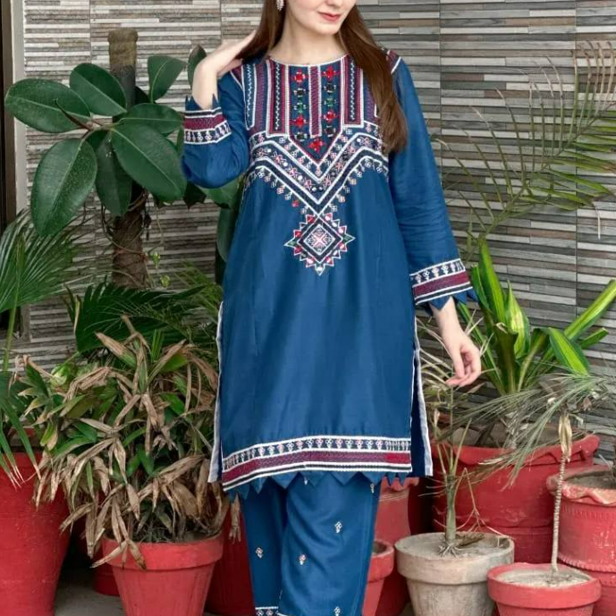 Ladies embroided 2pc suit in lilen fabric