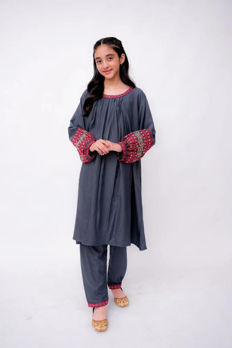 2 Piece Embroidered Frock with Trouser.This 2-piece baggy-style outfit exudes comfort and style, featuring relaxed silhouettes that effortlessly combine modern fashion with a laid-back vibe. The standout embroidered sleeves add a touch of elegance and artistry, elevating the overall look.