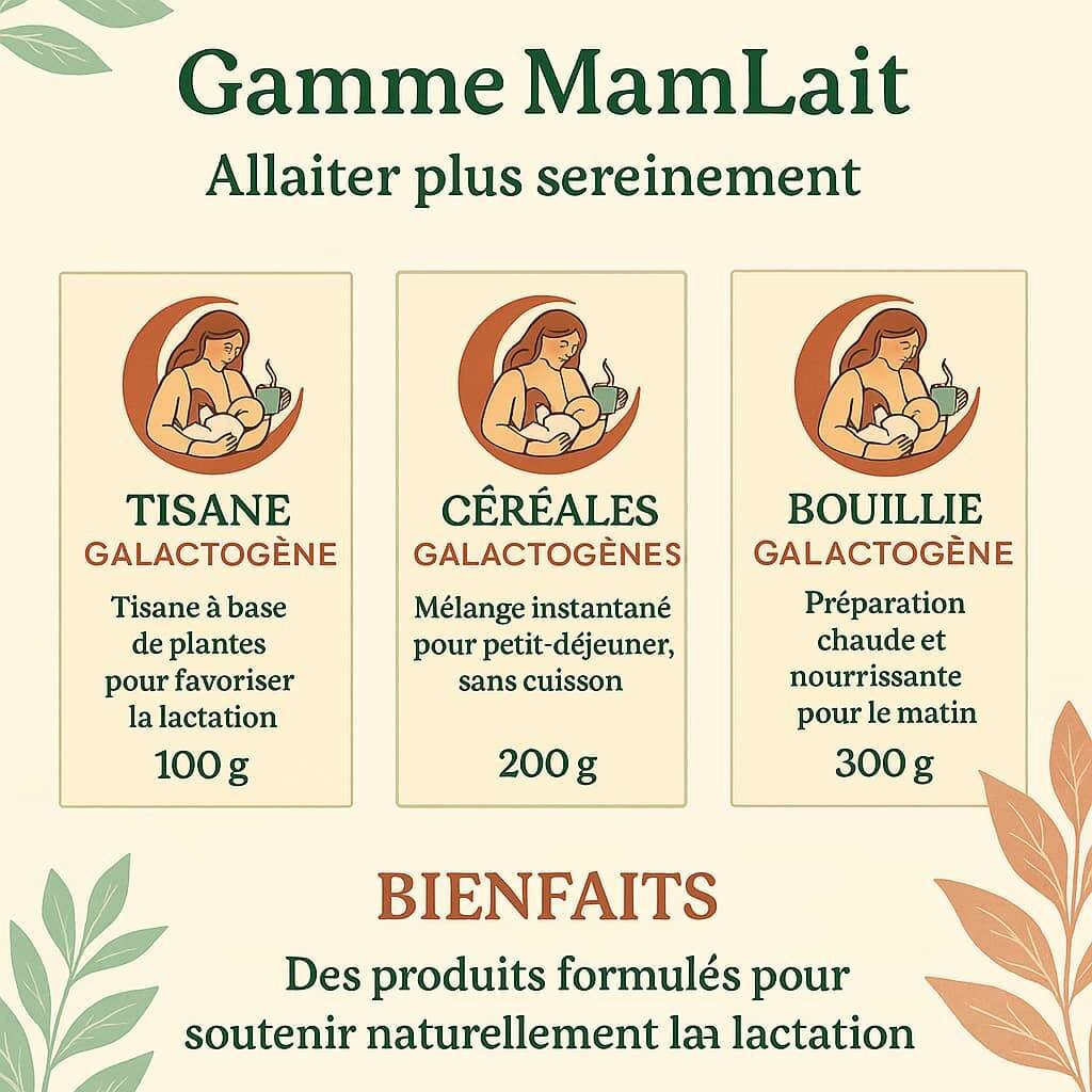 Boostez votre lactation avec notre gamme MamLait. Comprend tisane, céréales et bouillie pour un soutien naturel et efficace de la lactation. Parfait pour les mamans désirant un allaitement serein et nourrissant.