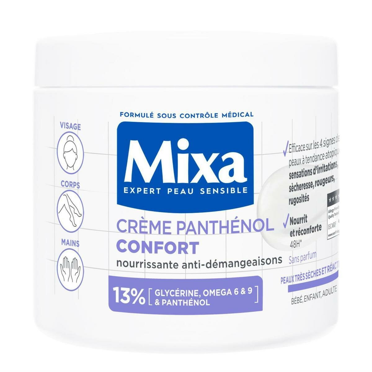 Crème nourrissante Mixa avec panthénol pour apaiser les démangeaisons, enrichie en glycérine et oméga 6 & 9. Idéale pour les peaux sensibles du visage, corps et mains, offrant confort et hydratation 48h.