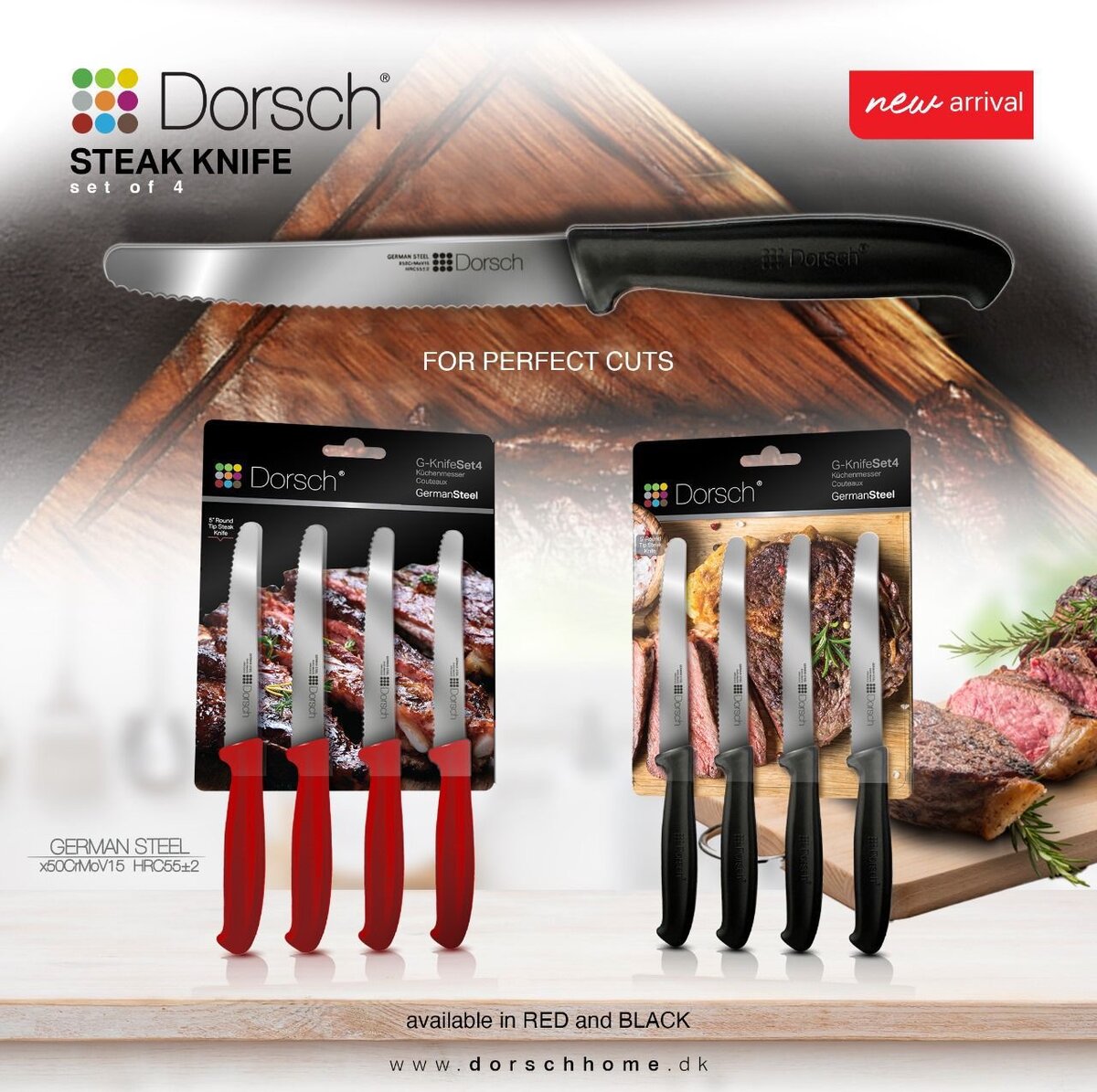 احصل على قطع مثالية مع مجموعة سكاكين الستيك من دورش. مصنوعة من الفولاذ الألماني لتقديم أفضل أداء وراحة أثناء تقطيع اللحوم. متوفرة بمقبض أحمر أو أسود لتناسب ذوقك. مثالية للمطابخ المنزلية أو كهدية لمحبي الطبخ.