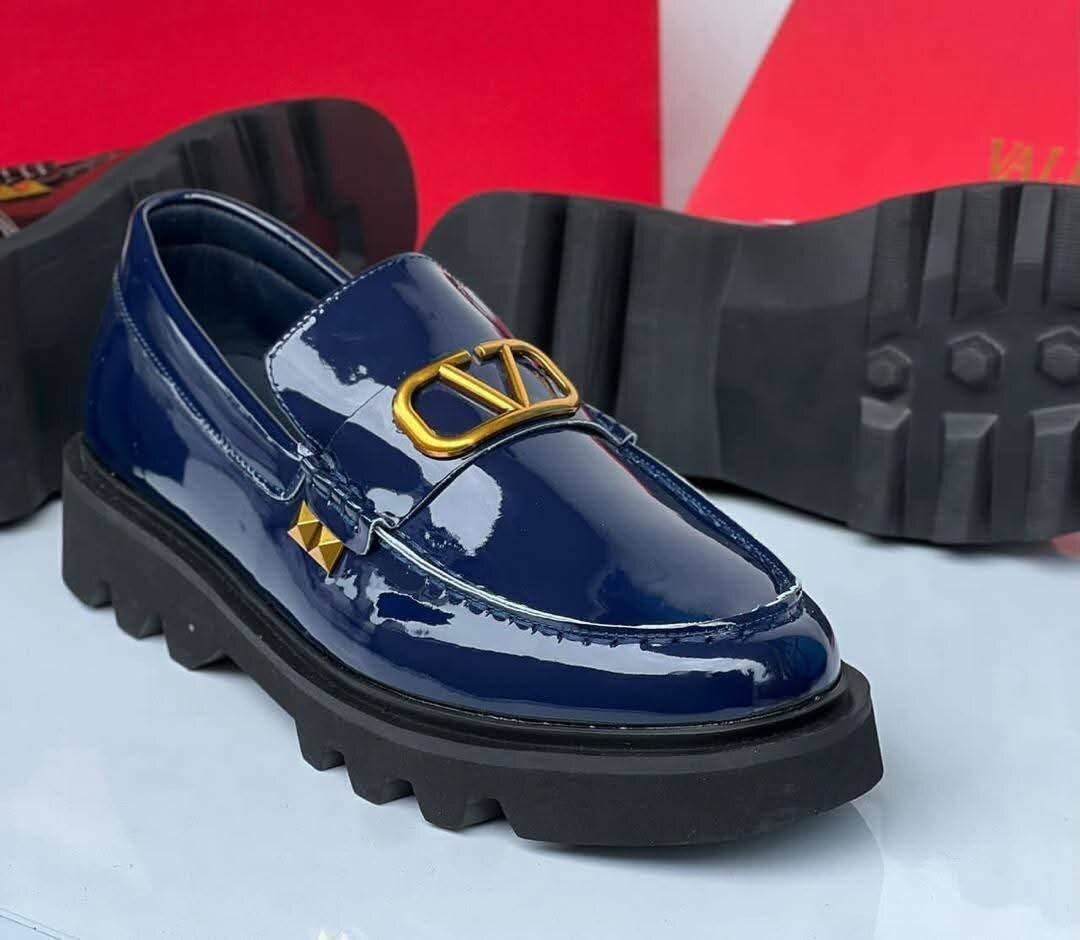 Mocassins élégants en cuir verni bleu avec semelle épaisse. Idéals pour une touche de style unique et audacieuse dans votre tenue quotidienne. Confortables et durables.