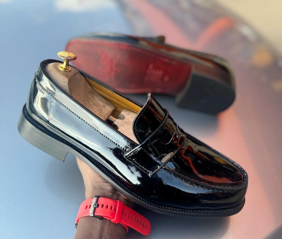 Mocassins élégants pour hommes en cuir verni noir. Idéals pour les occasions formelles et le travail. Confortables et stylés, ces mocassins rehausseront votre allure. Talon robuste pour un meilleur soutien.