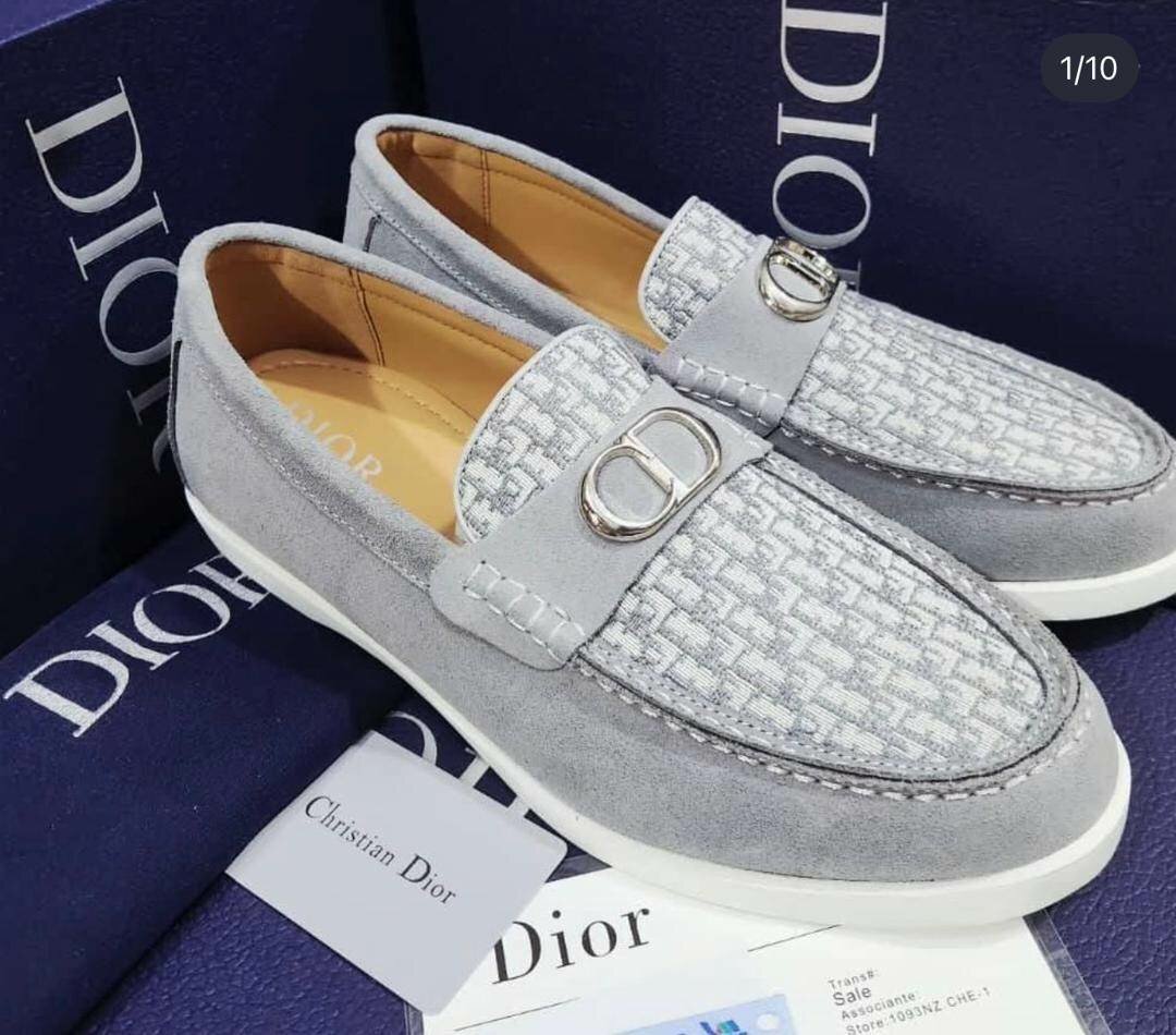 Élégants mocassins Dior pour homme, en daim gris de qualité supérieure avec motif tissé, offrant confort et style. Parfaits pour une tenue chic et décontractée.