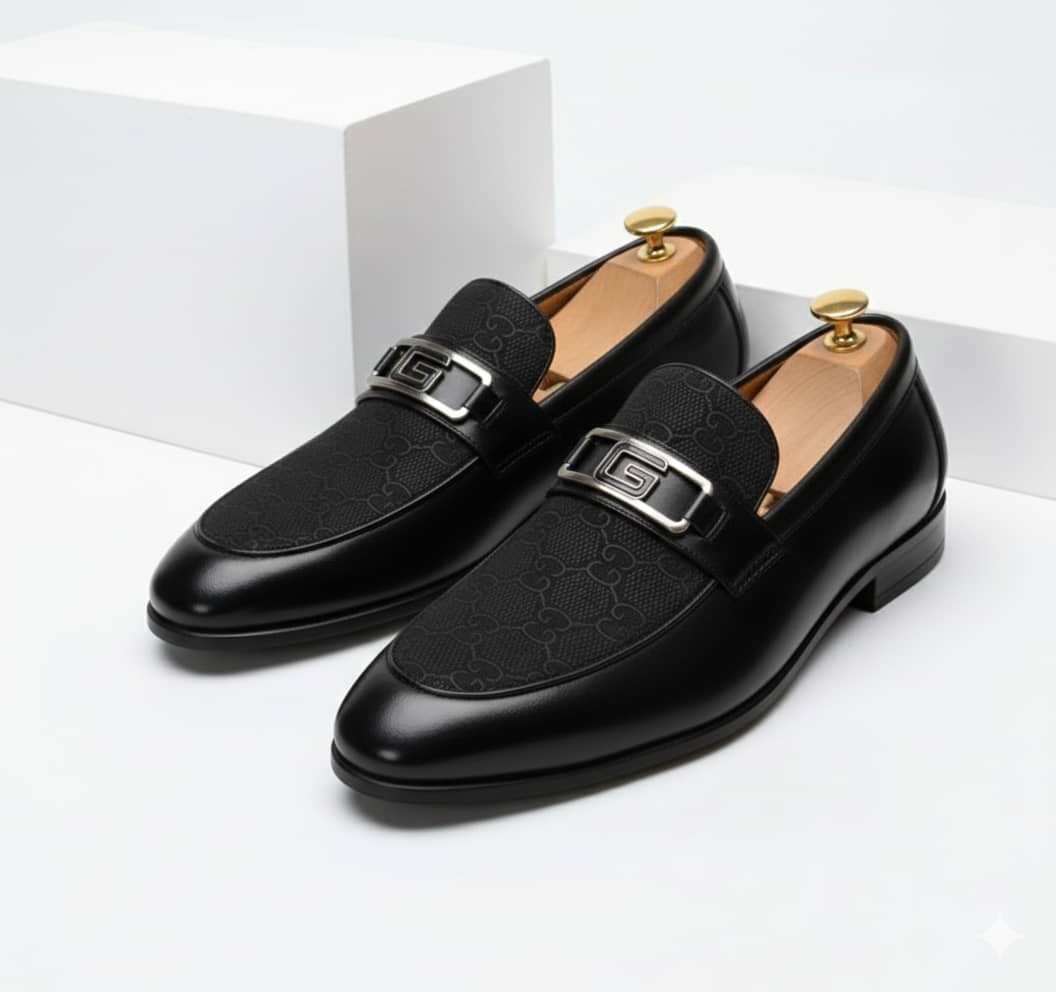 Découvrez ces mocassins en cuir noir de luxe, dotés d'une boucle métallique raffinée et d'un motif brodé sophistiqué. Parfaits pour des tenues formelles ou des occasions spéciales, ils offrent un confort exceptionnel et une touche d'élégance. Un choix idéal pour les hommes modernes et élégants.