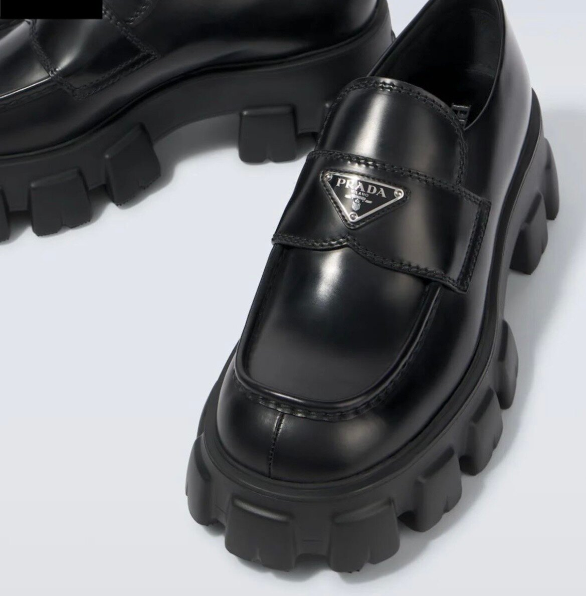 Découvrez l'élégance des mocassins Prada en cuir noir avec semelle épaisse. Parfaits pour un style audacieux et un confort supérieur. Idéal pour les amateurs de mode recherchant qualité et design.