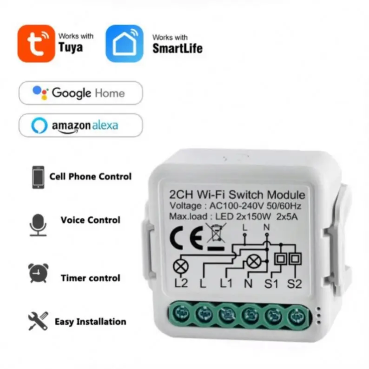 Contrôlez vos lumières à distance avec ce module de commutateur Wi-Fi intelligent. Compatible avec Tuya et SmartLife, fonctionne avec Google Home et Amazon Alexa. Installation facile, contrôle par application et vocal.