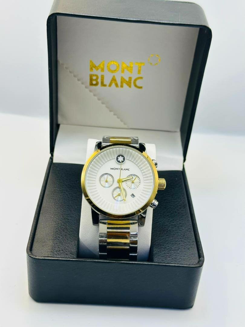 Élégante montre Montblanc pour hommes, avec un cadran blanc et un bracelet en acier inoxydable doré. Parfaite pour les occasions spéciales ou le quotidien.
