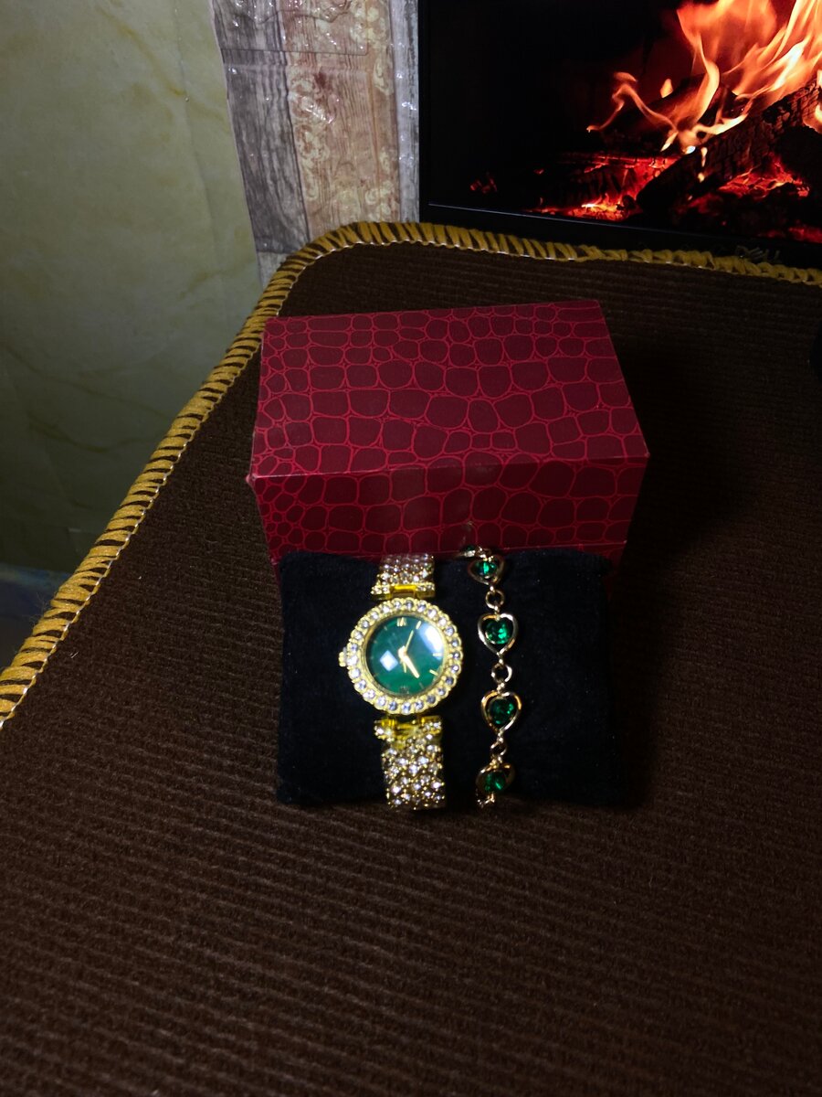 Élégant ensemble de montre et bracelet en doré avec détails émeraude. Idéal pour des soirées ou comme cadeau spécial, cet ensemble ajoute une touche de luxe à votre tenue. Parfait pour ceux qui aiment un style sophistiqué et unique.