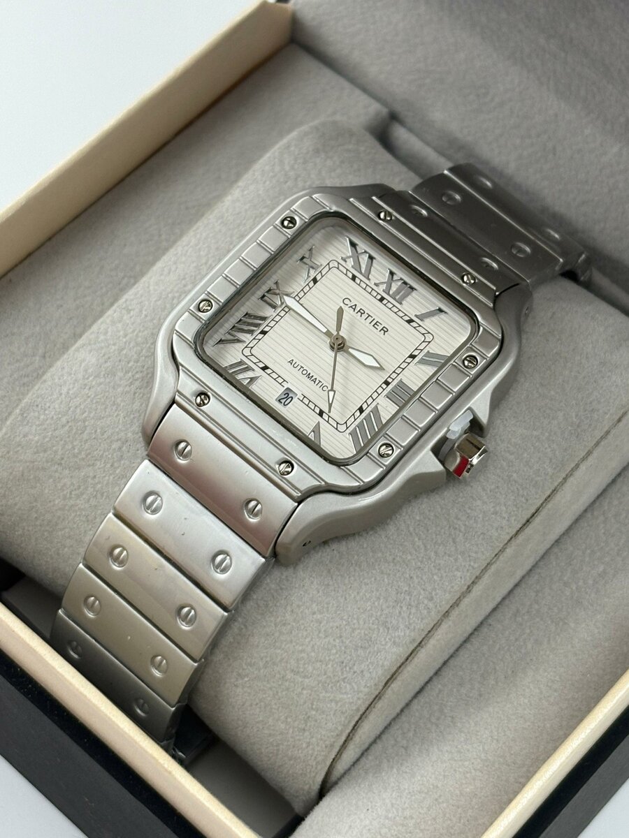 Découvrez le luxe intemporel de la montre Cartier Santos pour homme. Conçue avec un boîtier en acier inoxydable, cette montre incarne l'élégance avec son cadran carré distinctif et ses chiffres romains. Idéale pour les occasions formelles comme pour un usage quotidien, elle allie style et fonctionnalité. Parfaite pour ceux qui recherchent une montre à la fois classique et moderne.