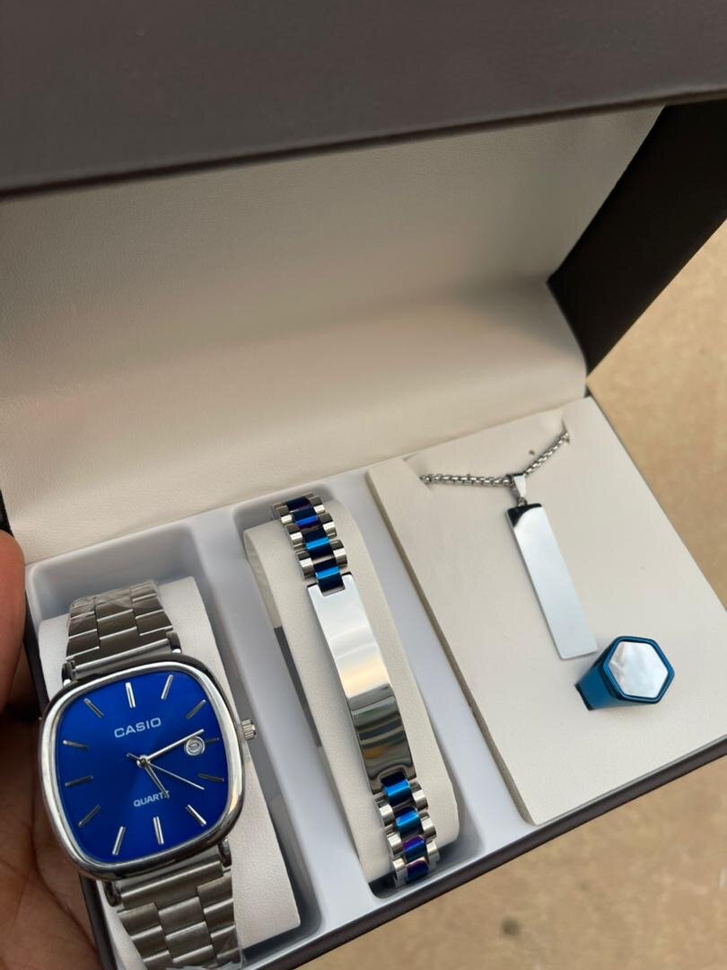 Ensemble élégant comprenant une montre CASIO avec un cadran bleu, un bracelet interchangeable et un pendentif. Un cadeau idéal pour les hommes qui apprécient le style et la précision.