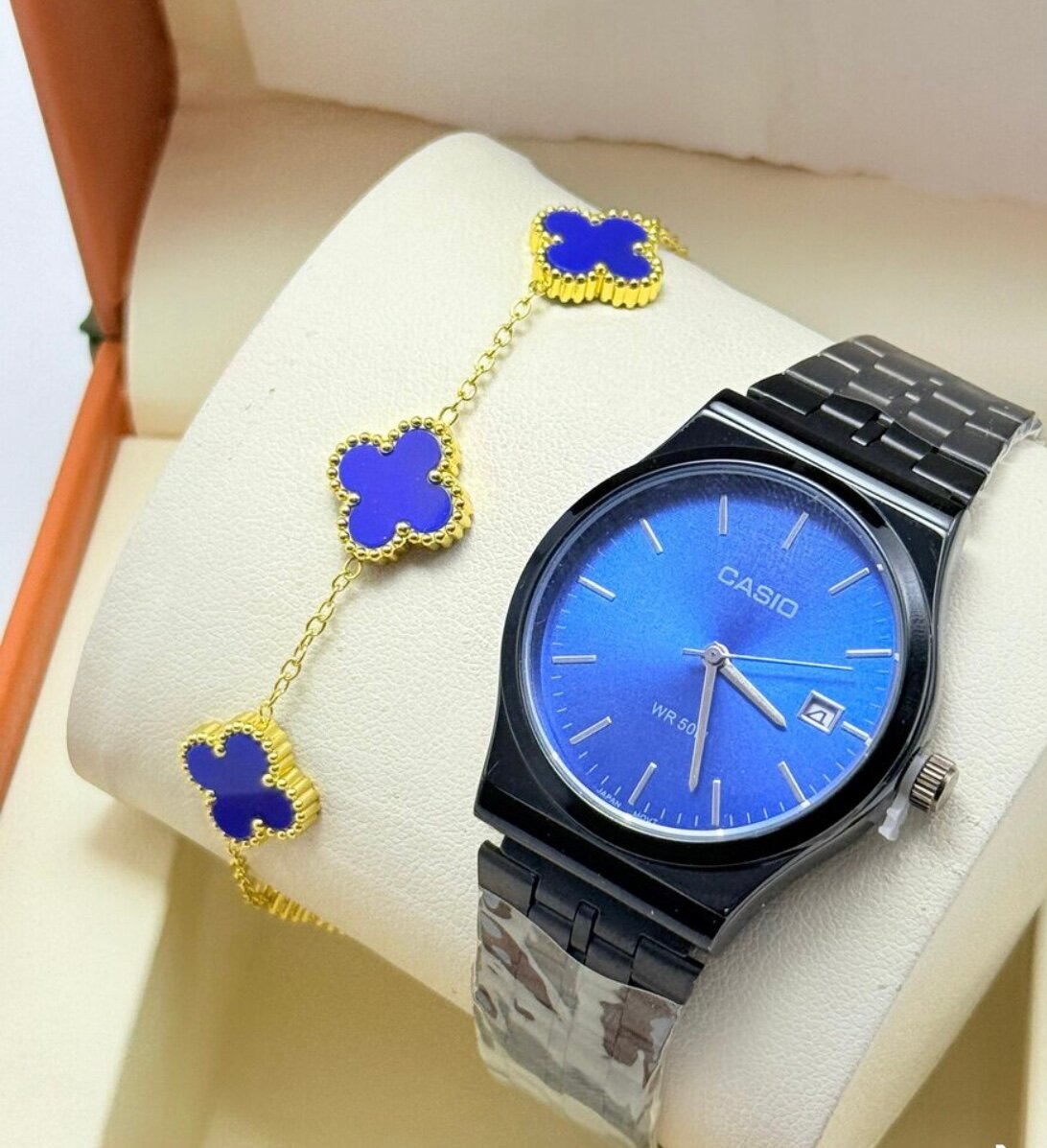 Élégante montre Casio avec un cadran bleu et un bracelet en acier. Parfaite pour les occasions spéciales, elle est accompagnée d'un bracelet en or avec des motifs en forme de trèfle bleu.