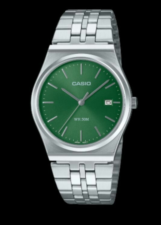 Découvrez la montre Casio à cadran vert et bracelet en acier inoxydable, résistante à l'eau jusqu'à 50m. Un choix élégant et durable pour un style quotidien raffiné.