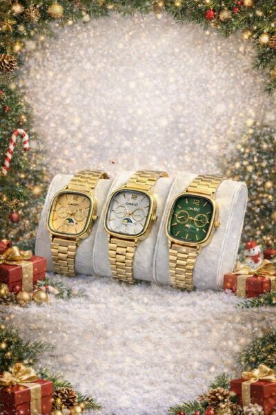 Coffret de 3 montres Casio dorées, bracelet acier, avec cadrans or, blanc et vert. Design élégant et festive, parfait pour offrir. Produit neuf.