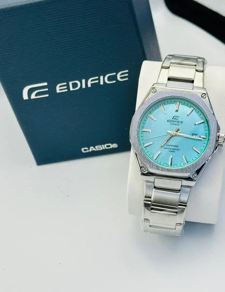 montre chrome Casio avec cadran bleu