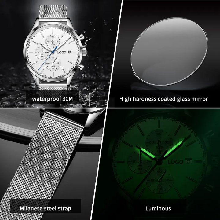 Découvrez notre montre chronographe homme avec bracelet en acier milanais. Étanche jusqu'à 30M, elle est dotée d'un cadran en verre haute résistance et d'aiguilles lumineuses. Choisissez parmi plusieurs couleurs et personnalisez votre style.
