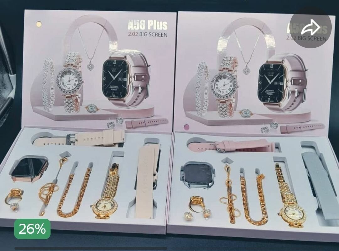 Découvrez notre ensemble cadeau A56 Plus, qui comprend une montre élégante avec écran 2.02 pouces et des accessoires assortis en or et argent. Parfait pour ajouter une touche de luxe à votre style quotidien. Idéal comme cadeau pour toutes les occasions.