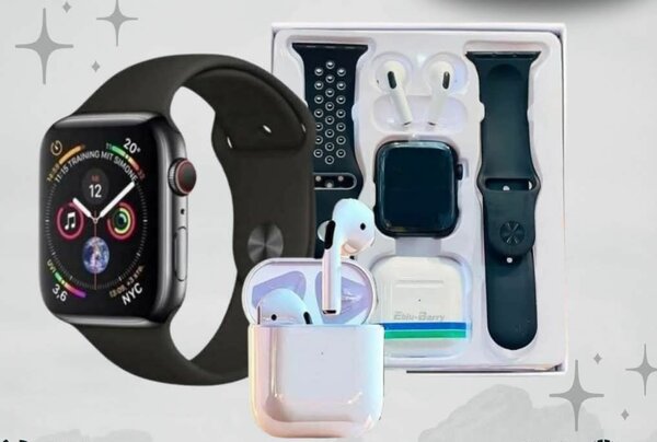Une montre connectée Deux bracelets Écouteurs Bluetooth Chargeurs -reçois tout les notifications -reçois les appels entrants et sortants Etc..