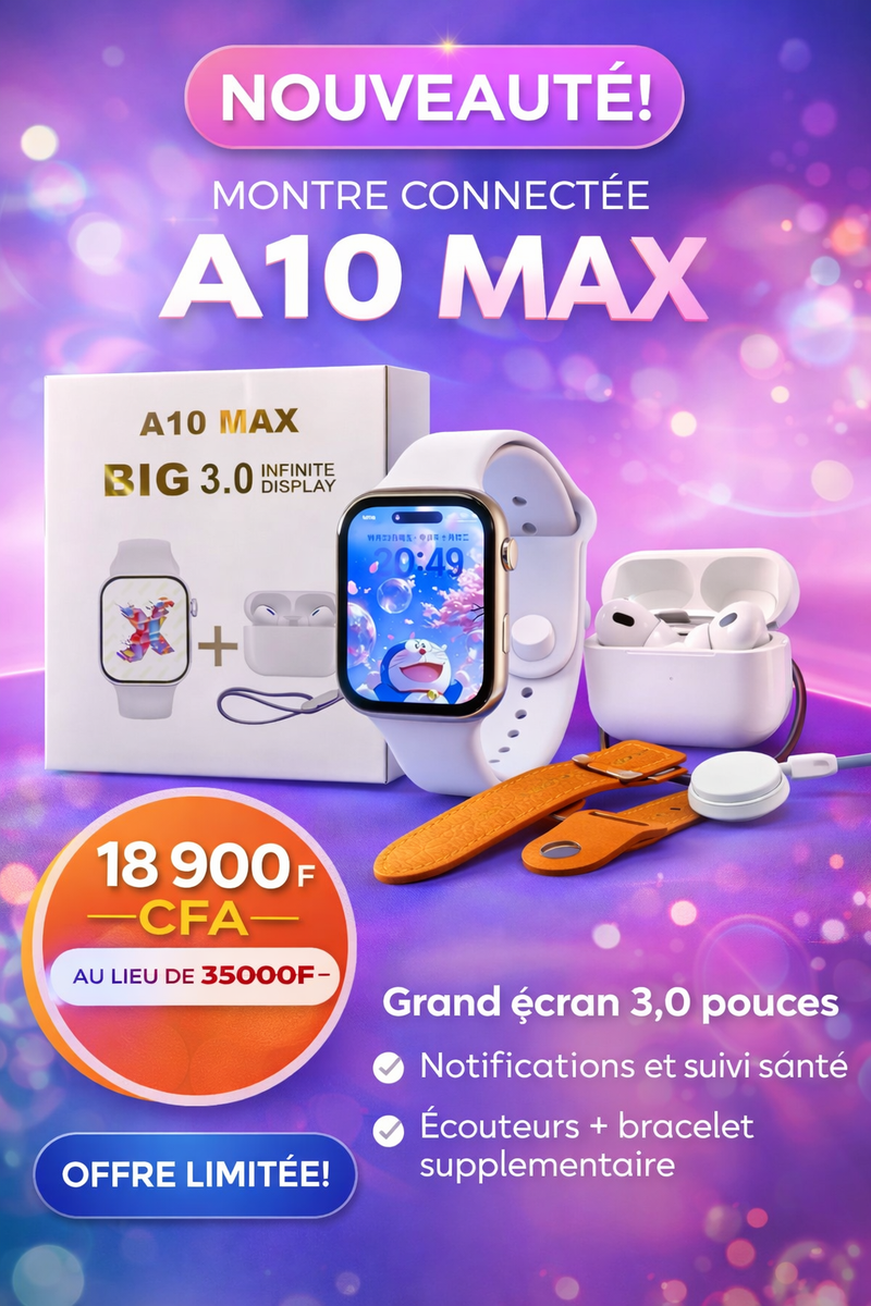 Découvrez la montre connectée A10 Max avec un écran de 3,0 pouces, parfaite pour le suivi de la santé et les notifications. Comprend des écouteurs et un bracelet supplémentaire. Idéale pour la vie active!