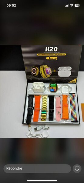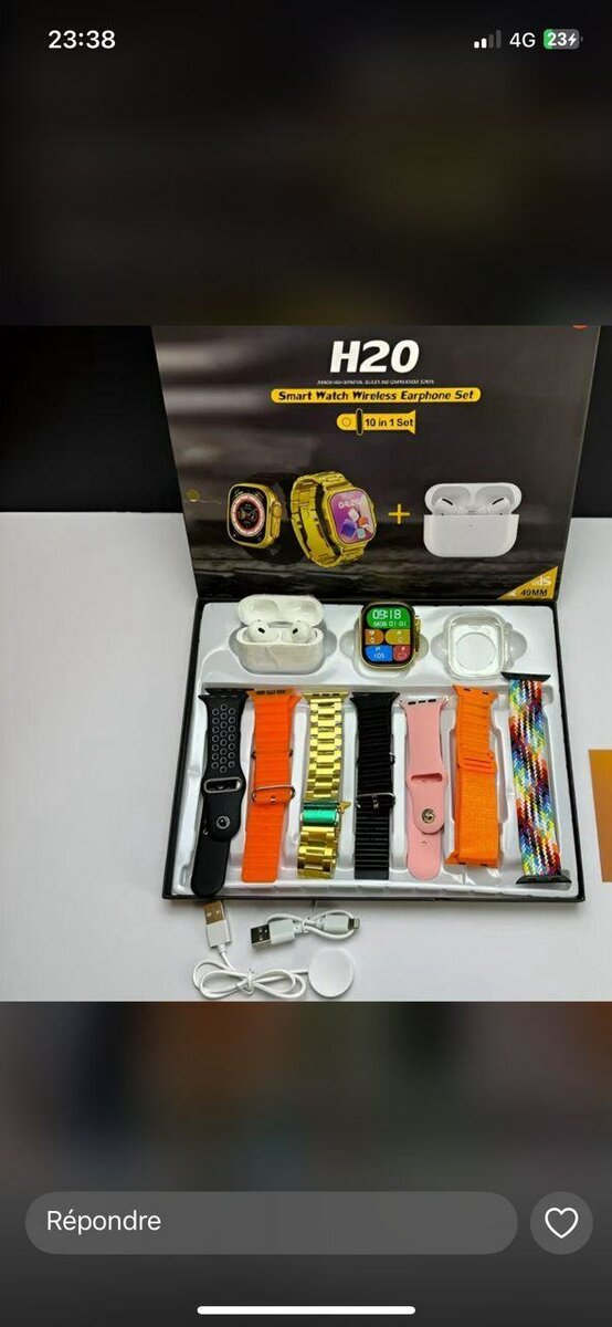 Découvrez la montre connectée H20 avec multiple bracelets pour s'adapter à votre style. Suivi fitness, notifications et plus. Idéale pour les athlètes ou pour un usage quotidien. Livrée avec écouteurs pour une expérience complète.