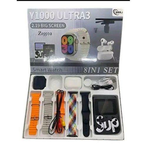 Découvrez la montre connectée Y1000 Ultra avec écran 2.19 pouces. Parfait pour les amateurs de technologie, ce set 8-en-1 inclut des bracelets interchangeables et des écouteurs sans fil. Idéal pour suivre vos activités au quotidien.