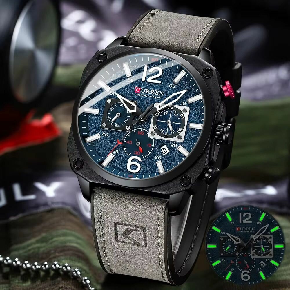 Découvrez la montre CURREN pour homme, un modèle de luxe avec un chronographe précis et un design élégant. Fabriquée avec des matériaux de qualité, cette montre est équipée d'un bracelet en cuir gris et d'un cadran bleu avec des aiguilles luminescentes. Idéale pour les hommes qui apprécient la précision et le style.