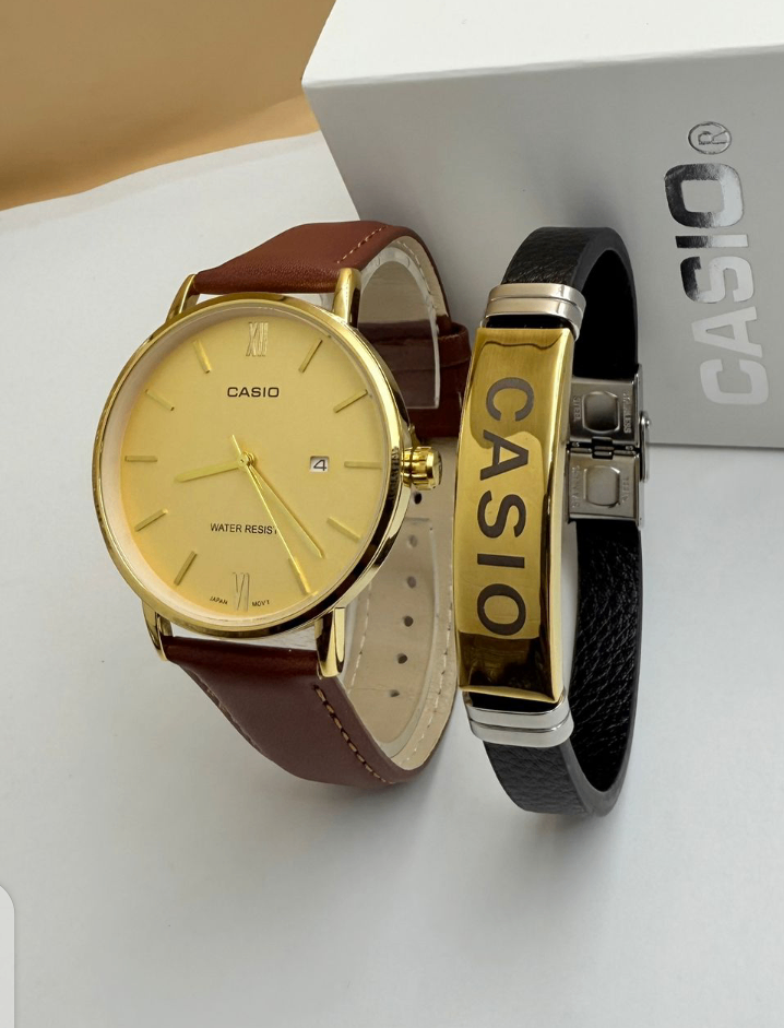 Découvrez cette élégante montre dorée Casio avec bracelet en cuir marron, accompagnée d'un élégant bracelet noir. Parfaite pour rehausser votre style quotidien avec une touche classique et sophistiquée. Résistante à l'eau, elle est idéale pour un usage quotidien ou un cadeau spécial.