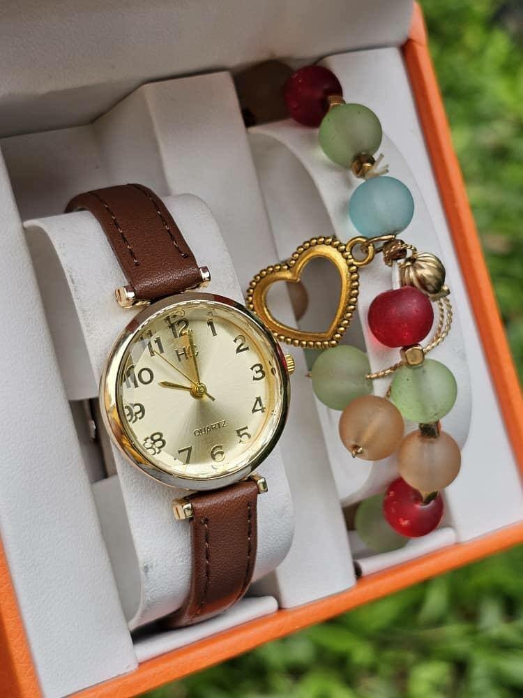 Découvrez notre montre élégante avec bracelet en cuir brun et cadran doré. Livrée avec un charmant bracelet perlé, elle est parfaite pour les occasions spéciales ou quotidiennes. Idéale pour ceux qui recherchent un accessoire à la fois fonctionnel et stylé. Design sophistiqué qui complète chaque tenue avec une touche de luxe.