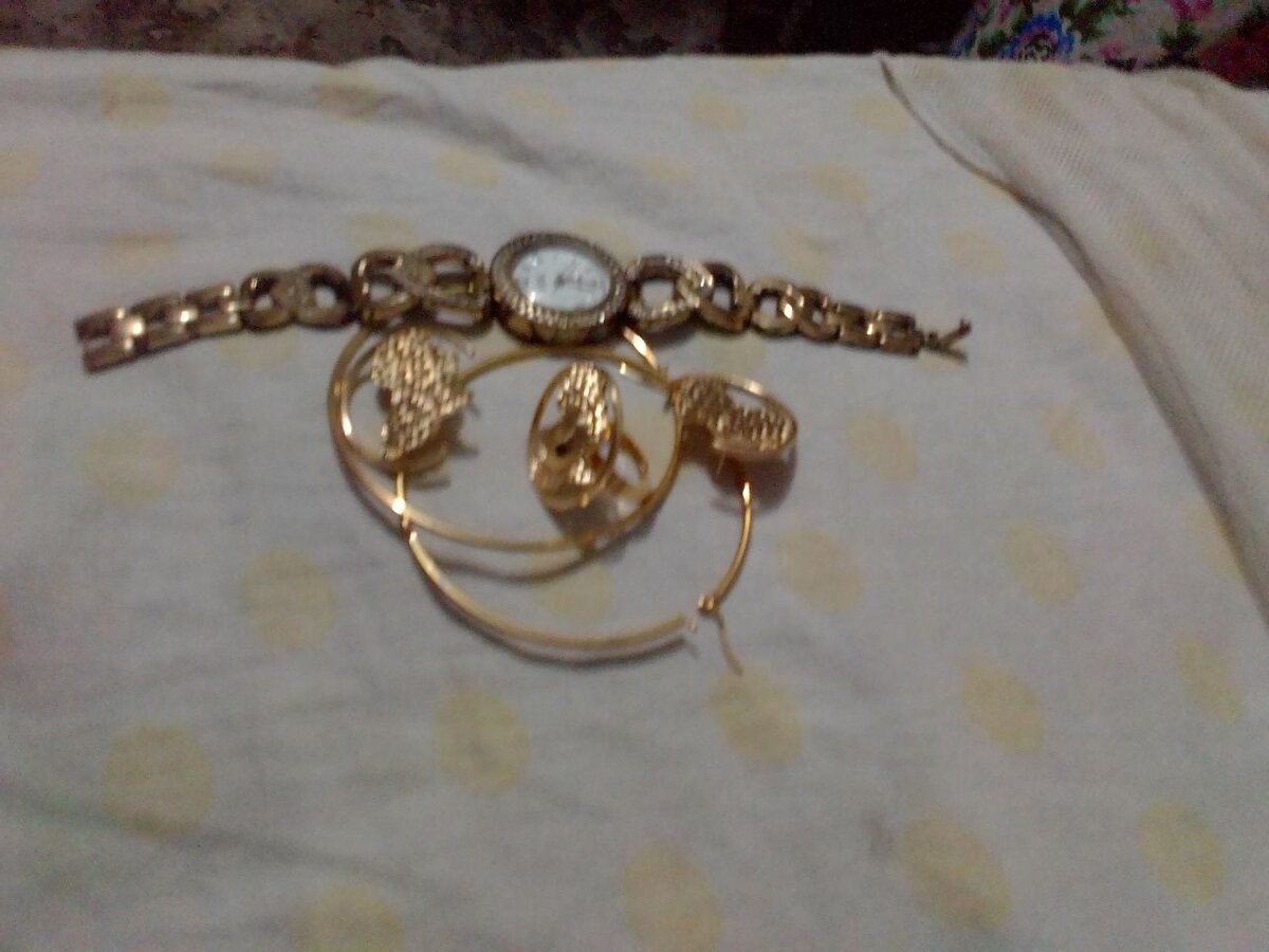 Élégante montre et bijoux dorés pour un style sophistiqué. Parfait pour rehausser votre tenue de soirée ou comme cadeau spécial.