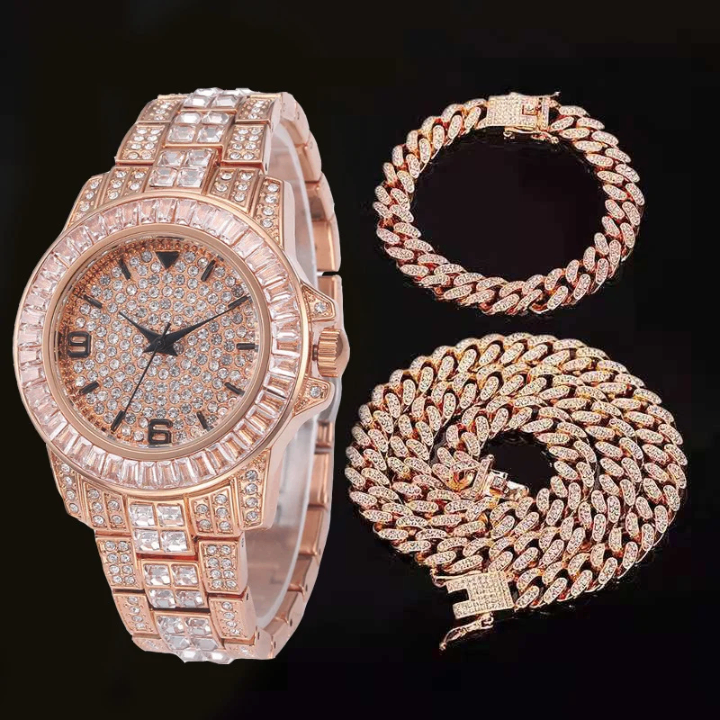 Élégant ensemble montre, bracelet et collier incrustés de strass scintillants. Parfait pour ajouter une touche de glamour à vos tenues de soirée. Disponible en divers coloris tendance, idéal pour les occasions spéciales ou comme cadeau raffiné. Design moderne et éclatant.