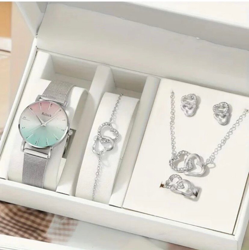 Découvrez cet ensemble luxueux comprenant une montre élégante et une collection de bijouterie en argent. Parfait pour les femmes modernes, ce set inclut une montre avec cadran multicolore et des bijoux coordonnés : bracelet, pendentif, boucles d'oreilles et bague. Idéal pour un cadeau spécial ou pour ajouter une touche de glamour à votre style quotidien. Design raffiné alliant élégance et modernité.