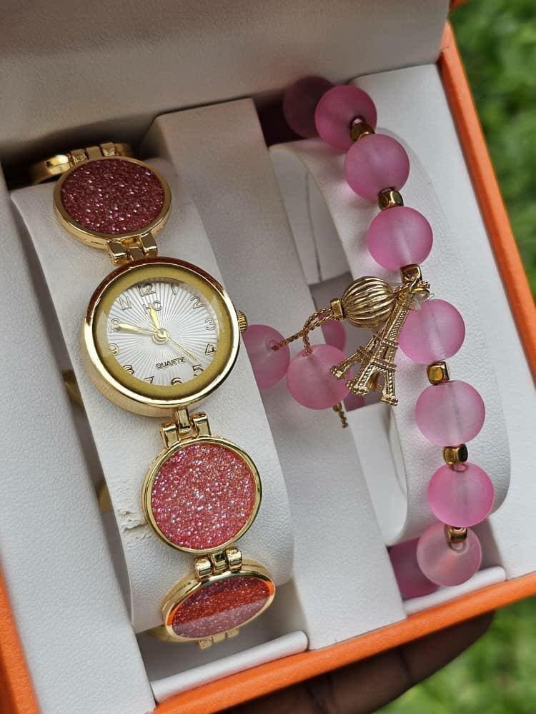 Élégante montre dorée avec bracelet strass et bracelet perlé rose. Parfait pour ajouter une touche chic à votre tenue. Idéal pour les occasions spéciales et les sorties. Faites briller votre style!