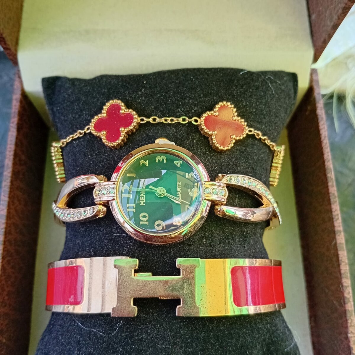 Ensemble élégant de montre et bracelets pour femmes, idéal pour toutes les occasions. La montre raffinée avec un cadran vintage est accompagnée de deux bracelets stylés, dont un avec des détails floraux et un autre en émail rouge, apportant une touche de glamour à votre poignet.