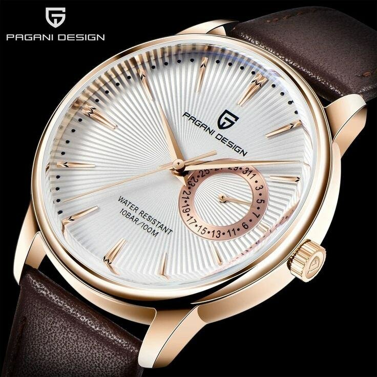 Découvrez la montre homme Pagani Design alliant sophistication et performance. Avec son boîtier en or rose et son bracelet en cuir marron, elle est parfaite pour toutes les occasions. Cette montre est étanche jusqu'à 100m, idéale pour un style de vie actif. Un choix parfait pour les hommes élégants et modernes.