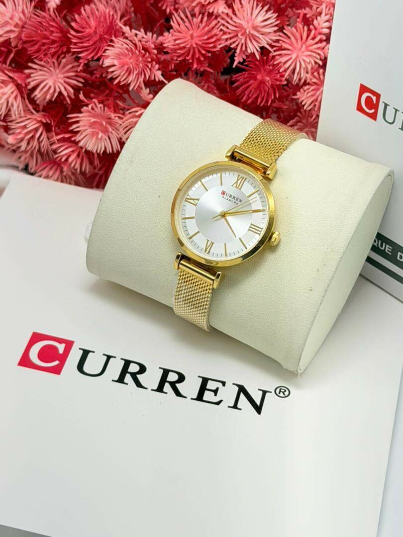 Élégante montre pour femme CURREN en or avec bracelet en acier inoxydable. Design classique avec cadran blanc et chiffres romains. Parfaite pour les occasions spéciales ou pour tous les jours.